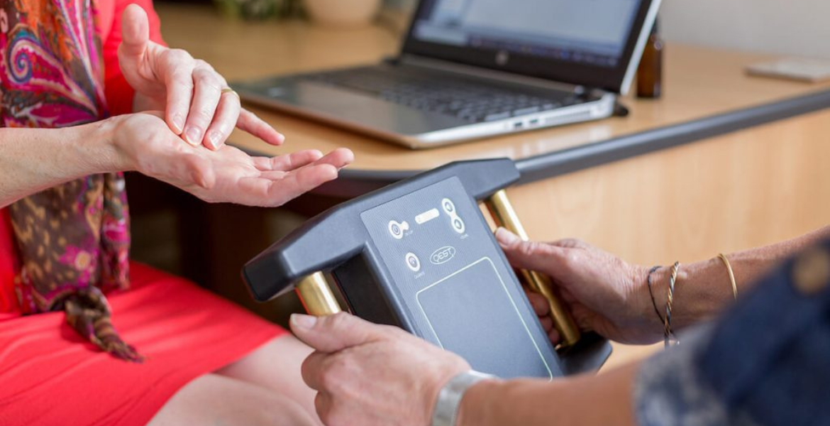 You attend a scheduled session in a calm, private setting. During the evaluation, you gently hold hand electrodes connected to the assessment system. The device measures bioenergetic response patterns through this non-invasive contact method.